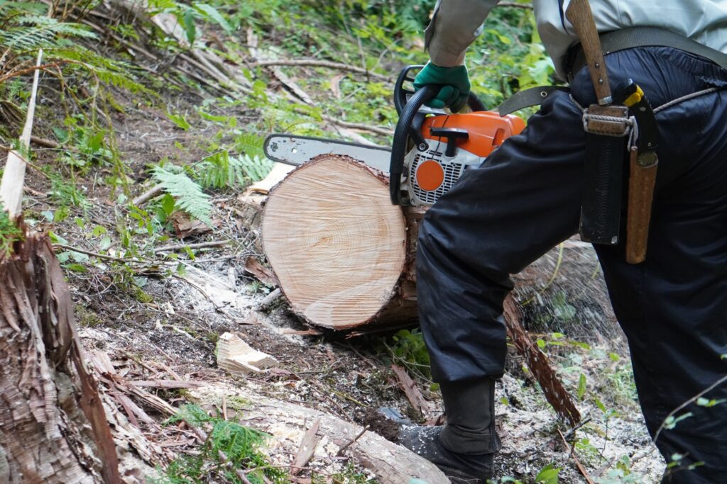 例えば**針葉樹(マツ・スギなど)**は幹がまっすぐで比較的伐採しやすい傾向がありますが、高さが出やすいため高所作業になることが多いです。